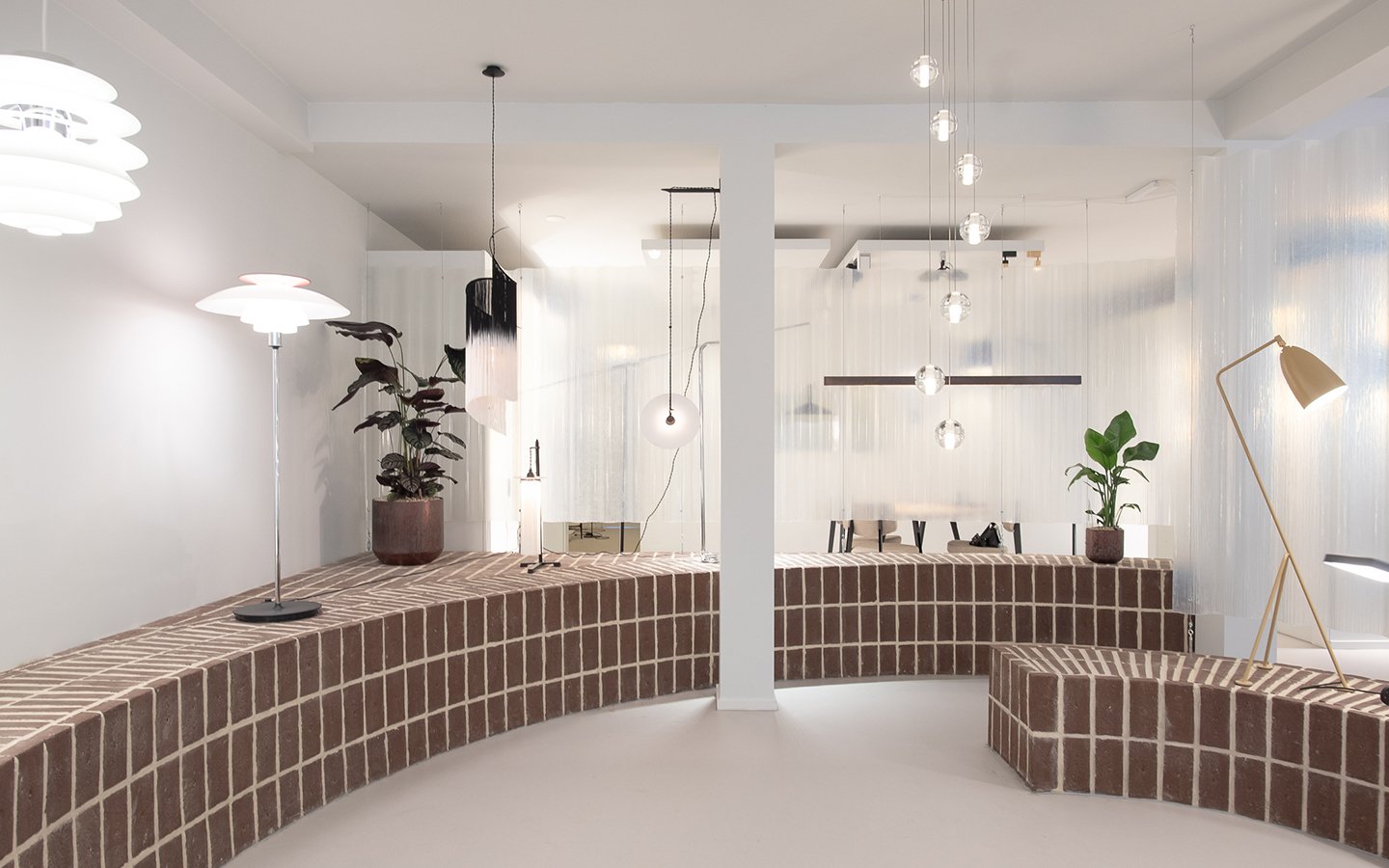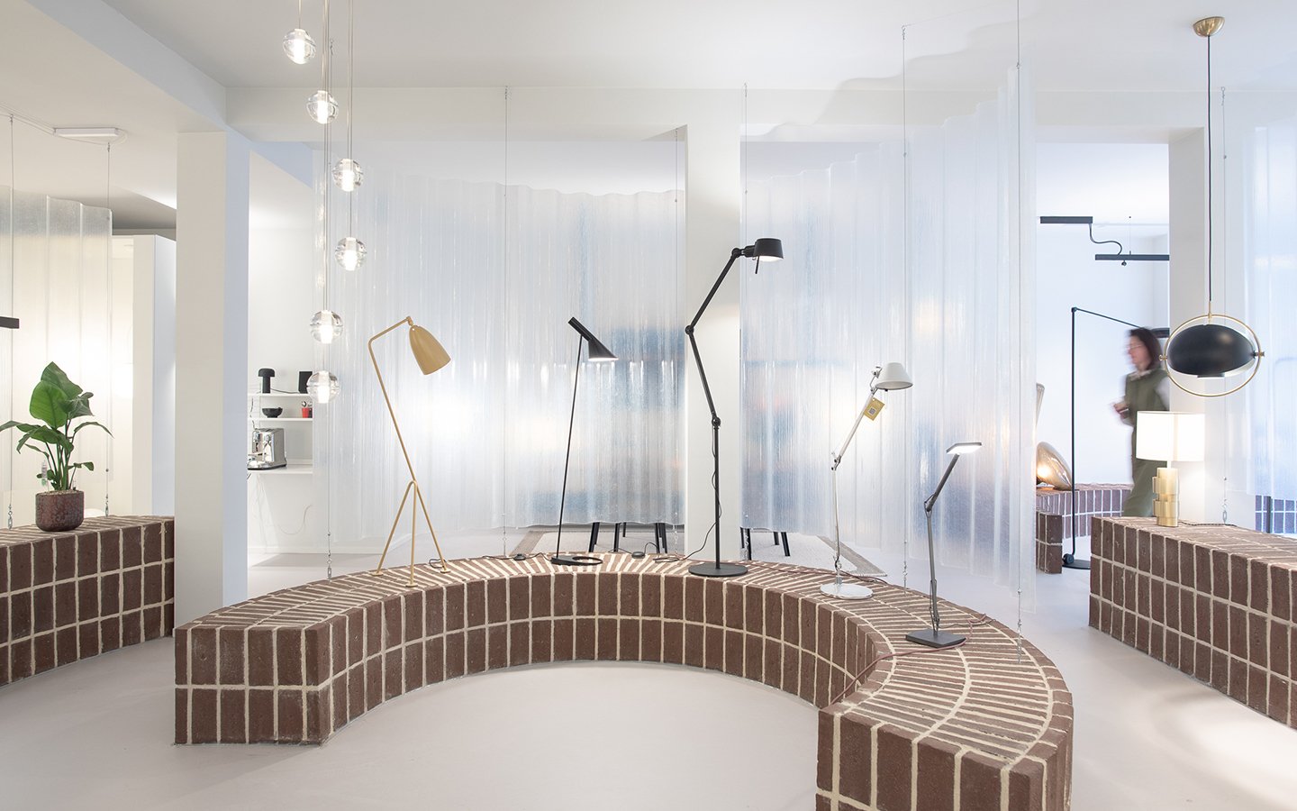 In het ontwerp zijn deze drie verschillende gebieden gescheiden middels één groot meubelstuk. De bakstenen podiums met rondingen en verschillende hoogtes maken de plek om de lampen goed tot zijn recht te laten komen. Hierboven hangen op verschillende plekken transparante polycarbonaat golfplaten, deze maken het licht in de andere gebieden diffuus om te voorkomen dat het kakofonie van verschillende lampen zou worden. Door gebruik te maken van ruwe materialen wordt het contrast groter met de strakke verlichting die er hangt. Uiteindelijk moeten de lampen de show stelen!