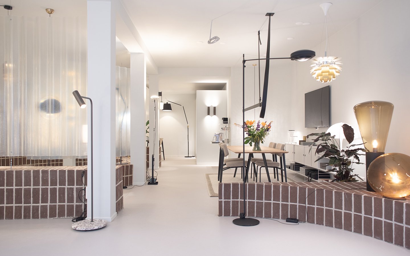 Je komt binnen in een uitnodigende huiselijk sfeer. Wanneer je doorloopt neemt het bakstenen meubelstuk je mee langs verschillende type lampen en sferen. Uiteindelijk komt de klant uit in het lichtlab waar wordt geholpen met het toepassen van de juiste verlichting voor jouw project.