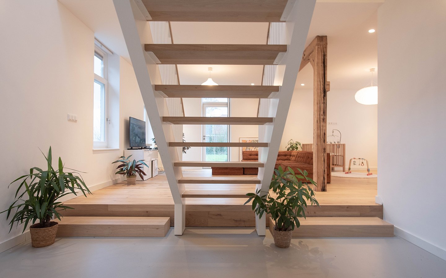 Een eyecatcher in het ontwerp is de dubbele steektrap in de centrale vide. Deze trap is speciaal ontworpen en gemaakt voor dit project. In samenwerking met de Hoop is een prachtige trap ontstaan die zowel ingetogen is in zijn uitstraling, maar grandioos in zijn verschijning. De prachtige details en de perfecte inpassing waren alleen mogelijk door de intensieve samenwerking met de Hoop.